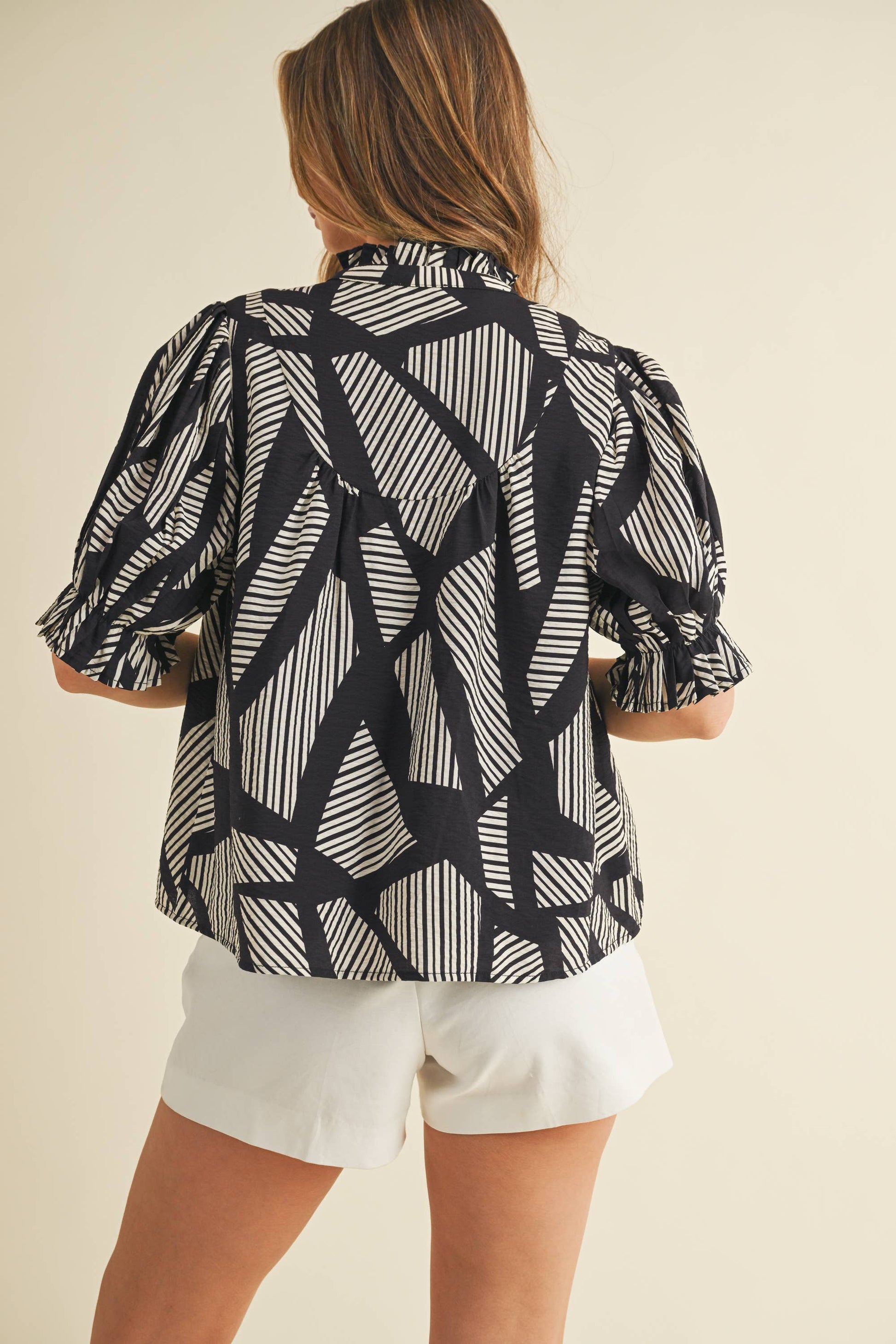 A modern statement blouse featuring bold geometric stripes and voluminous puff sleeves with cuff elastic. Ruffled neckline and button-front detail.
