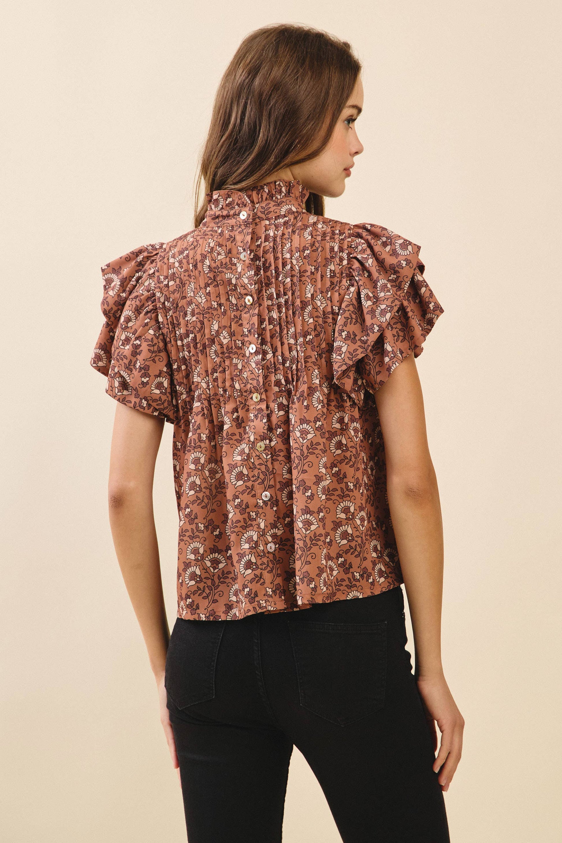 A floral print top featuring delicate pintuck detailing, ruffled short sleeves, and a mock neckline. A button-back closure and an easy, swingy silhouette.